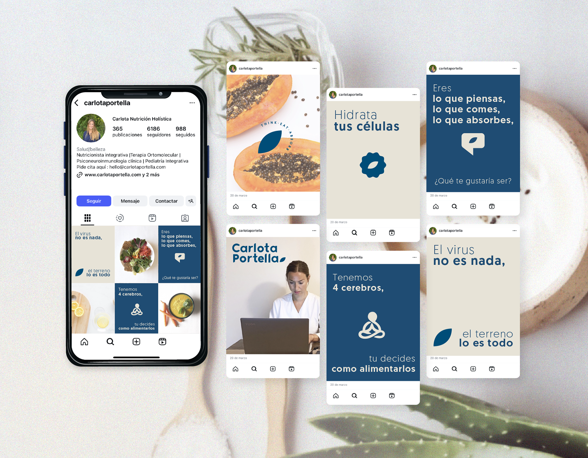 Conceptualización y desarrollo de identidad visual para servicios de nutrición holística. Diseño de marca y creación de templates para implementación de marketing y redes.